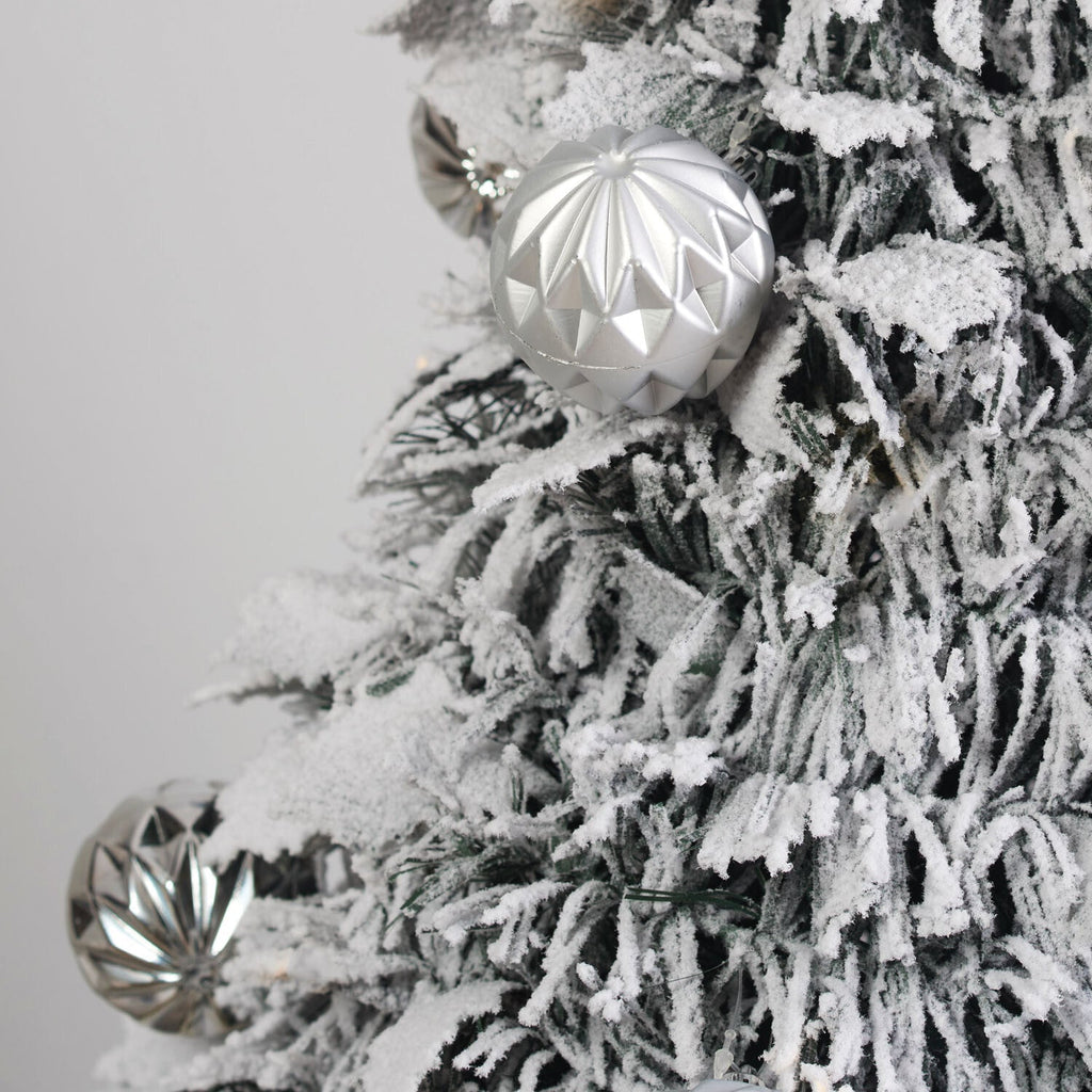 Para completar o charme, a árvore tem acabamento nevado e está decorada com bolas prateadas, trazendo ainda mais magia para o seu ambiente.