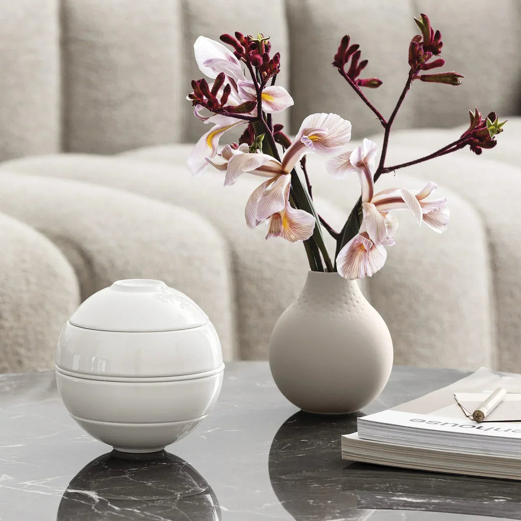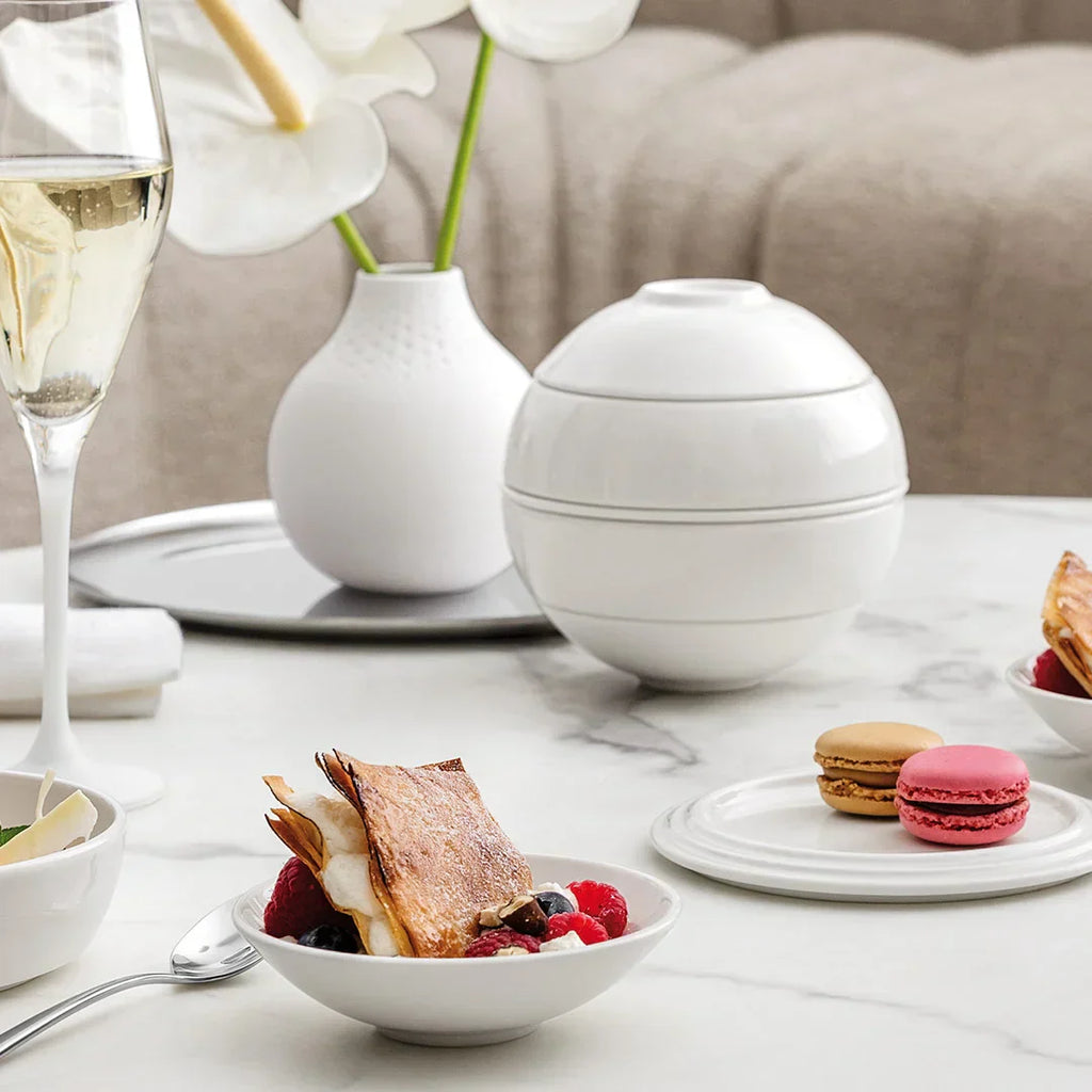A esfera La Boule é um conjunto de artigos de porcelana de qualidade premium concebidos para duas pessoas. Dois pratos planos, dois pratos universais, duas saladeiras e uma travessa se conectam magicamente e aparecem na forma de uma bola.