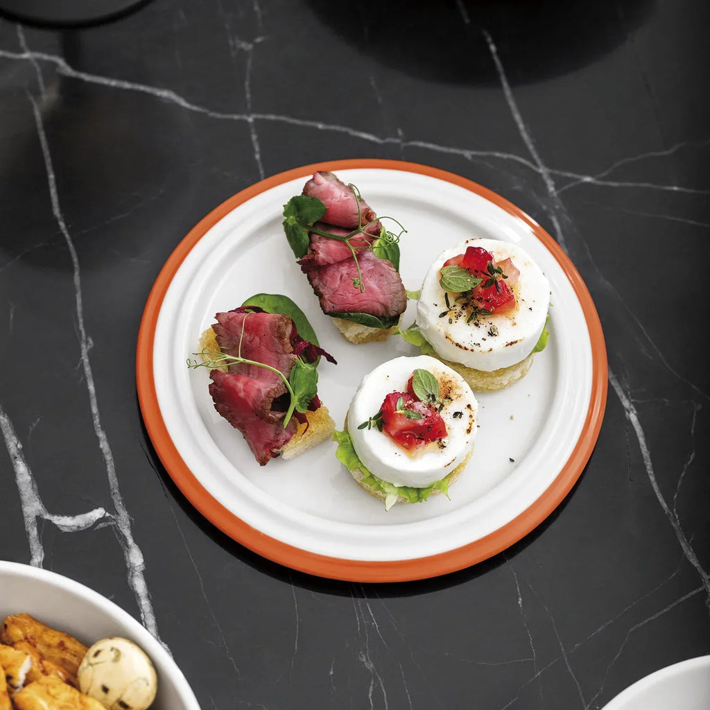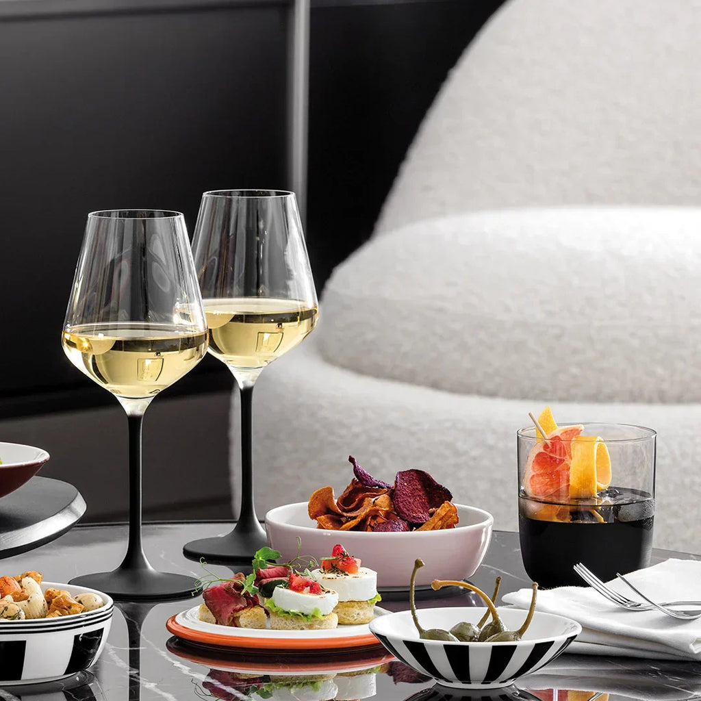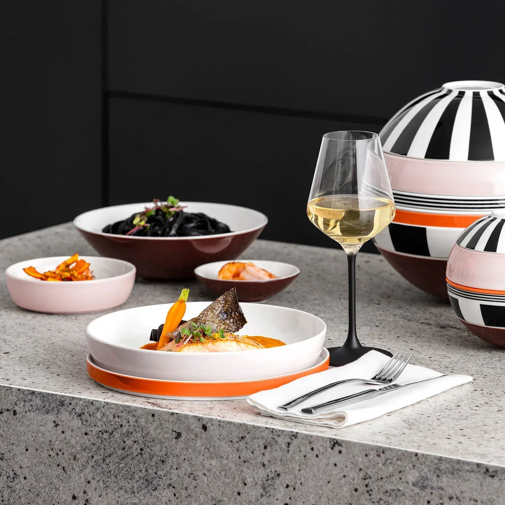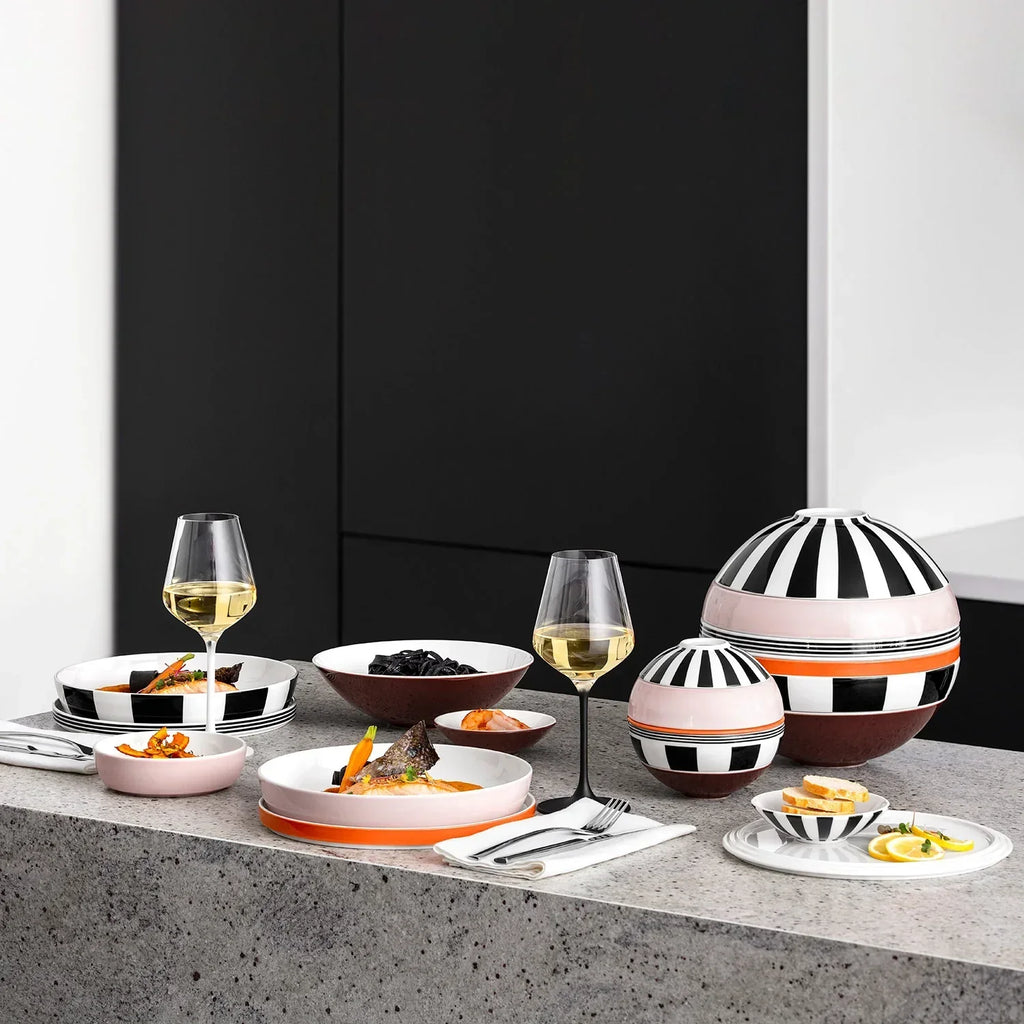 A esfera La Boule é um conjunto de artigos de porcelana de qualidade premium concebidos para duas pessoas. Dois pratos planos, dois pratos universais, duas saladeiras e uma travessa se conectam magicamente e aparecem na forma de uma bola.