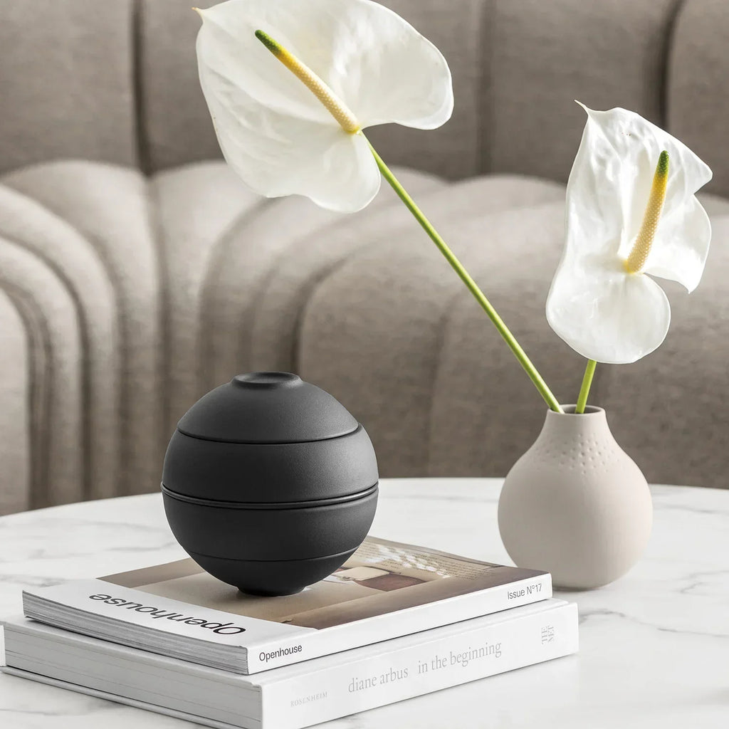 A esfera La Boule é um conjunto de artigos de porcelana de qualidade premium concebidos para duas pessoas. Dois pratos planos, dois pratos universais, duas saladeiras e uma travessa se conectam magicamente e aparecem na forma de uma bola.